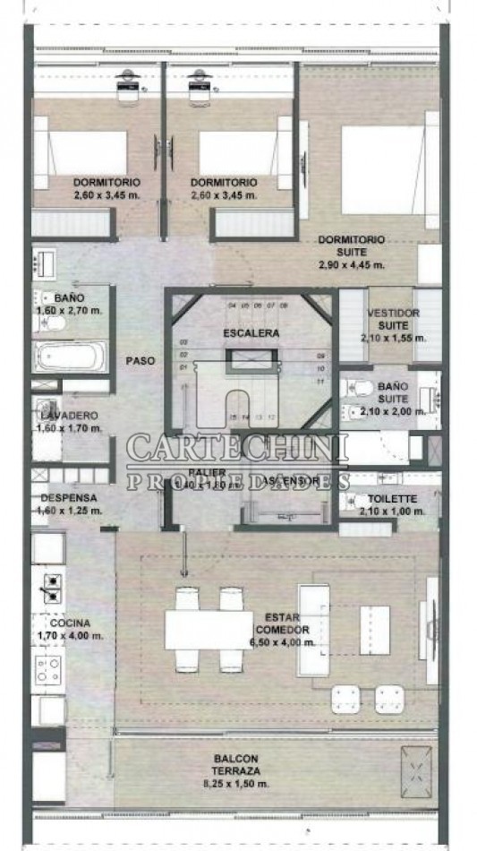 Diseño y Confort: Las unidades cuentan con tres dormitorios, incluyendo una suite principal con ducha escocesa y vestidor. Disfruta de un amplio living-comedor, cocina equipada, despensa, lavadero, toilette y un balcón terraza con parrilla.