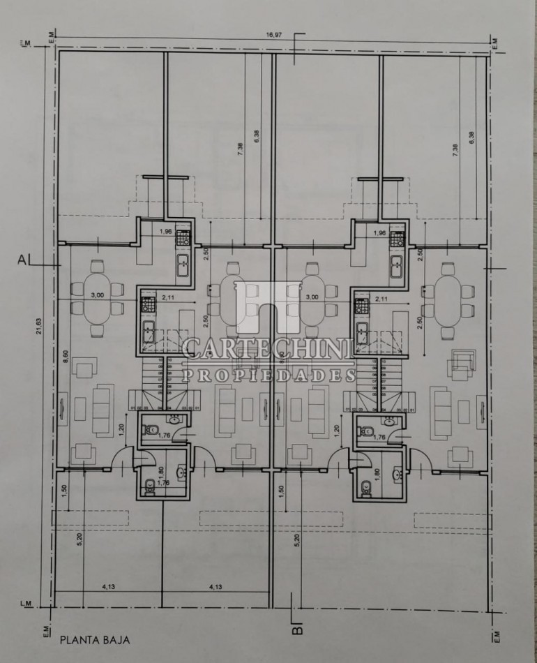 El lote mide de frente 16,97 mts y de largo 21,63 haciendo una superficie de 376m2.